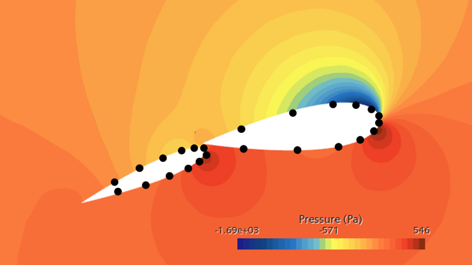 下图显示了一个压力分布示例。传感器可以沿着2D截面放置,如黑色标记所示。通过在轮廓上进行数值积分,可以得出二维力贡献。如果在翼展上的几个位置进行同样的操作,则第二次数值积分可以给出总力估计。